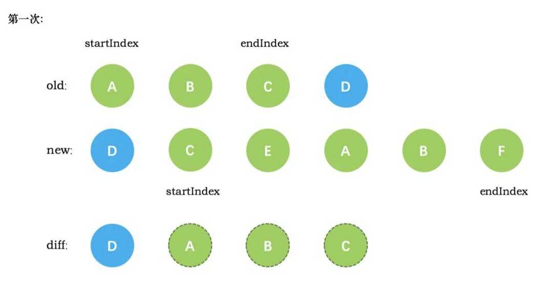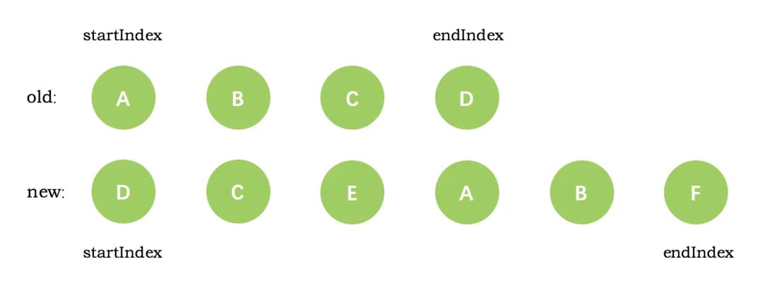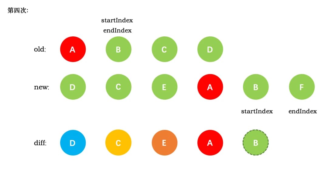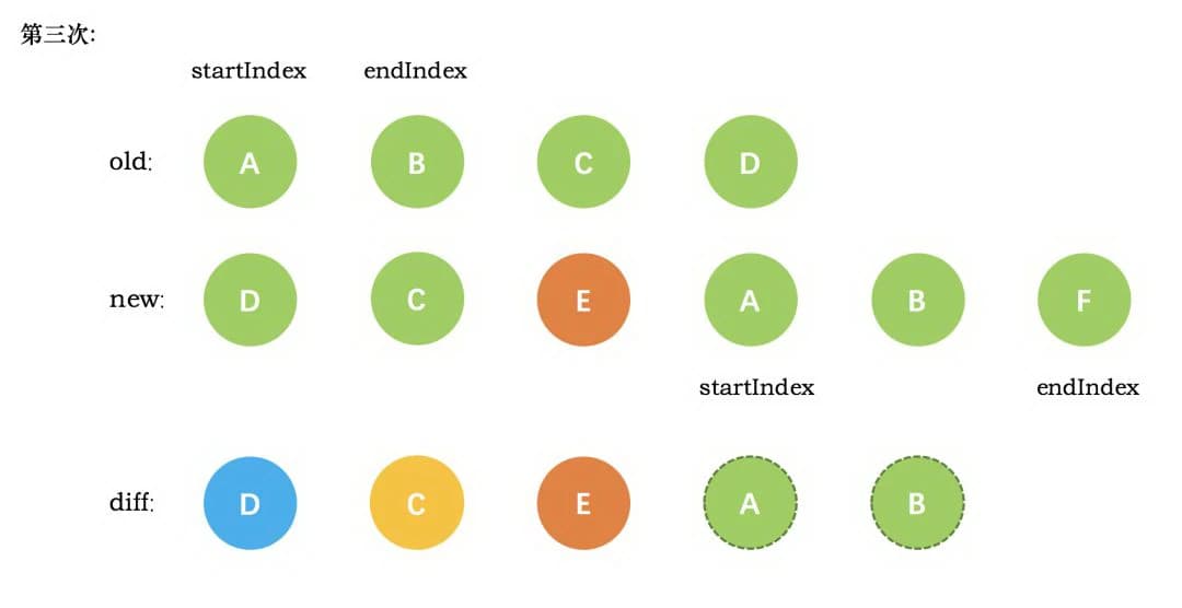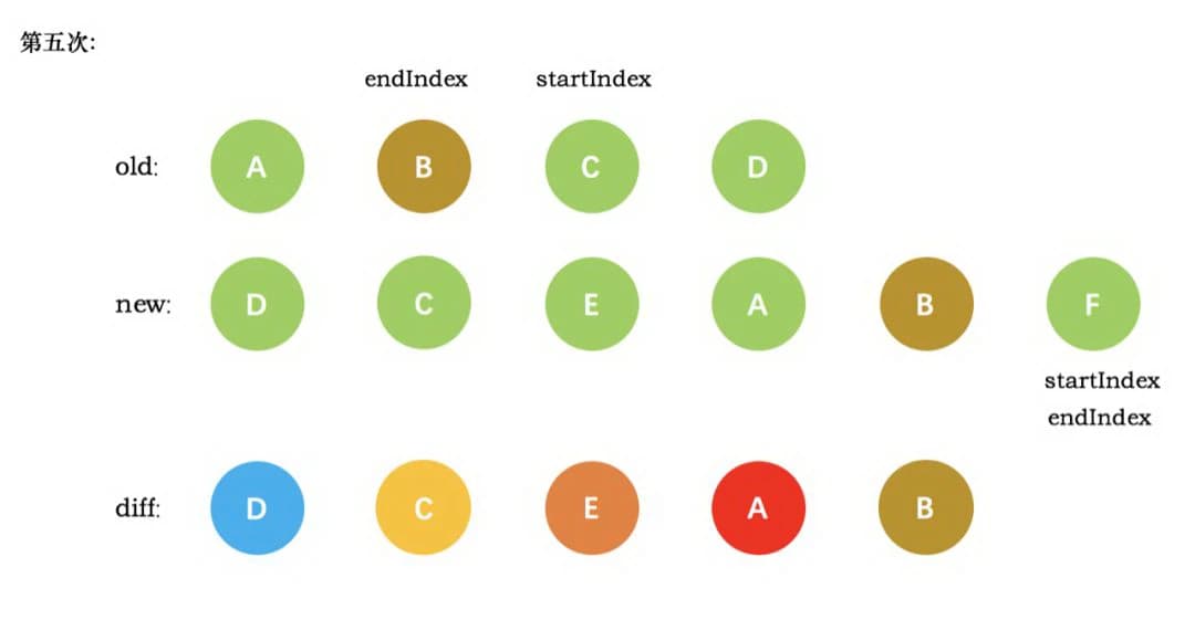 4、第三次循环中,发现 E 没有找到,这时候只能直接创建新的真实节点 E,插入到第二次创建的 C 节点之后。同时新节点的 startIndex 移动到了 A。旧节点的 startIndex 和 endIndex 都保持不动