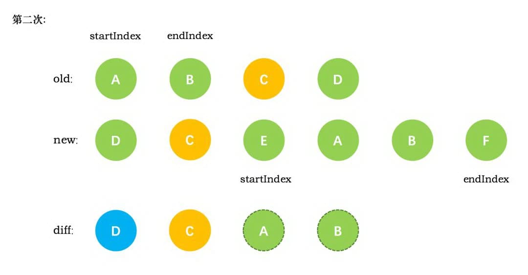 3、第二次循环后,同样是旧节点的末尾和新节点的开头(都是 C)相同,同理,diff 后创建了 C 的真实节点插入到第一次创建的 D 节点后面。同时旧节点的 endIndex 移动到了 B,新节点的 startIndex 移动到了 E